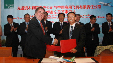 中國經濟網訊 2012年7月10日,范堡羅航展第二天,中國商飛公司與光譜資本有限責任公司(以下簡稱光譜公司)在英國倫敦簽署諒解備忘錄。