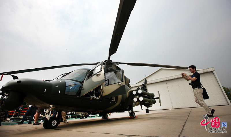 一名記者正在拍攝靜態展示區的直9-WZ武裝直升機。 攝影:中國網 楊佳