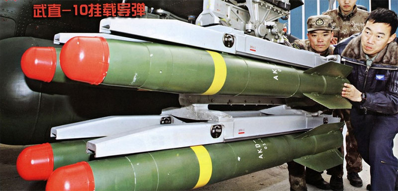 【環球網綜合報道】近日,一張國產新型直-10武裝直升機裝填彈藥的照片在網絡上曝光。照片中,一架直-10型武裝直升機的單個掛架上同時掛載了一個副油箱和4枚反坦克導彈。據悉,該型導彈是我國最新研制的AKD-10型反坦克導彈,該型導彈是專門為武裝直升機研制的空對地型攻擊導彈。有分析稱,AKD-10導彈性能強大,可以快速捕獲和自動跟蹤目標,打擊精度在3米以內,可在3000米的距離捕獲目標,飛行距離在5000米以上。