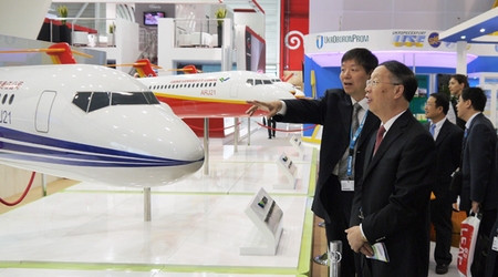 在中國(guó)商飛公司展區(qū),蘇波認(rèn)真察看了C919大型客機(jī)混合級(jí)布局以及ARJ21-700飛機(jī)混合級(jí)、全經(jīng)濟(jì)級(jí)、行政機(jī)和公務(wù)機(jī)布局模型,聽(tīng)取了公司兩大型號(hào)的最新研制進(jìn)展、能力建設(shè)、人才隊(duì)伍建設(shè)、國(guó)際合作、民機(jī)產(chǎn)業(yè)體系建設(shè)等方面情況的匯報(bào)。蘇波表示,中國(guó)商飛公司成立5年來(lái)取得的成績(jī)令人鼓舞,工信部將一如既往地支持中國(guó)商飛公司的發(fā)展建設(shè),希望中國(guó)商飛公司再接再厲、奮力拼搏,爭(zhēng)取早日取得大型客機(jī)項(xiàng)目的成功。