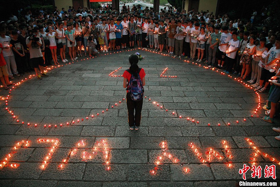 7月8日,市民在江山市須江公園內為韓亞空難遇難中國女生默哀祈福。7日凌晨,在美國舊金山國際機場著陸時失事的韓亞航空公司波音777型客機已經造成至少2人死亡,韓亞航空向浙江江山市政府發去傳真,稱根據登機牌,參加江山中學赴美夏令營的兩名女生王琳佳和葉夢圓在此次空難中不幸罹難。中新社發 李晨韻 攝