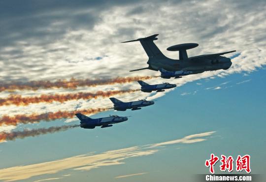 國產預警飛機經過嚴格試飛定型后,裝備部隊并參與執行新中國成立60周年大閱兵任務。圖為預警機和護衛飛機進行飛行編隊訓練。 譚超 攝