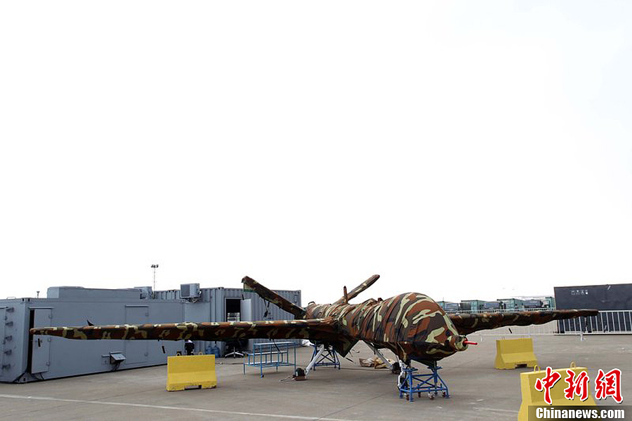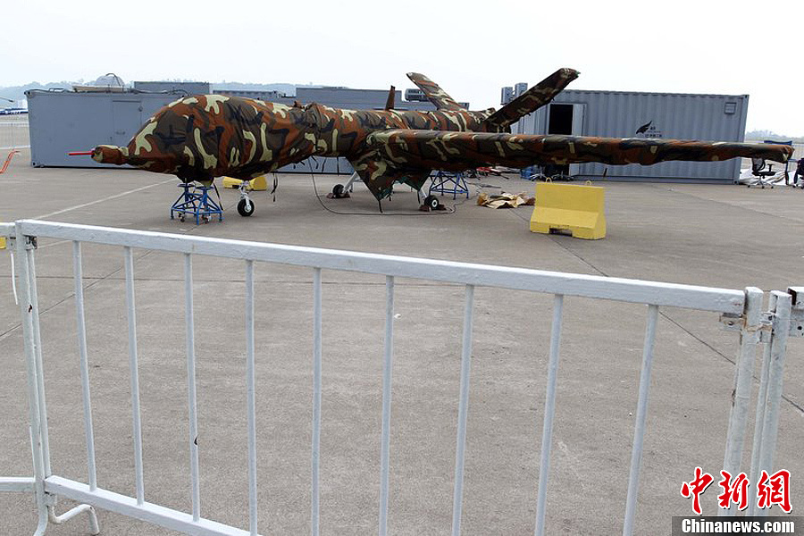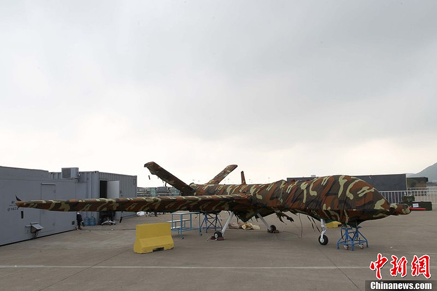 曾在前兩屆珠海航展上展出模型的翼龍無人機(jī),在今年航展上以實物參展。11月8日,該機(jī)已經(jīng)組裝完畢停放在展坪上。該款無人機(jī)由中航工業(yè)旗下成都飛機(jī)設(shè)計研究所研制,該機(jī)裝有一臺100馬力活塞發(fā)動機(jī),具備全自主平輪式起降和飛行能力,最大起飛重量達(dá)1100公斤,最大續(xù)航時間為20個小時,可攜帶各種偵察、激光照射/測距、電子對抗設(shè)備及小型空地打擊武器,可執(zhí)行監(jiān)視、偵查及對地攻擊任務(wù)等任務(wù),也可用于維穩(wěn)、反恐、邊界巡邏等。