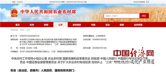 經濟日報-中國經濟網北京7月14日訊 近日,中央農辦、農業農村部、發展改革委、財政部、人民銀行、銀保監會、證監會等7部門聯合印發《關于擴大農業農村有效投資 加快補上“三農”領域突出短板的意見》(以下簡稱《意見》),部署擴大農業農村有效投資,為打贏脫貧攻堅戰和全面建成小康社會提供堅實支撐。
