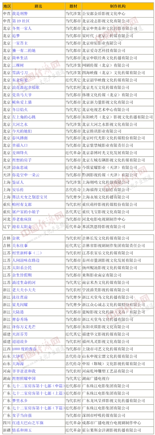 《廣播電視總局辦公廳關于2020年10月全國拍攝制作電視劇備案公示的通知》明確,按題材劃分,當代題材42部、1477集,分別占公示總數(shù)的73.68%和72.72%,其中,當代都市題材22部792集,當代農村題材8部256集,當代青少題材3部83集,當代涉案題材5部196集,當代其它題材4部150集。