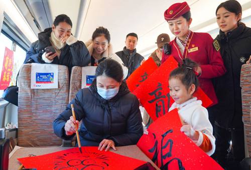 津興城際G8844次列車上,旅客現(xiàn)場(chǎng)手寫書法福字、畫龍頭。(中國(guó)鐵路北京局集團(tuán)有限公司供圖)