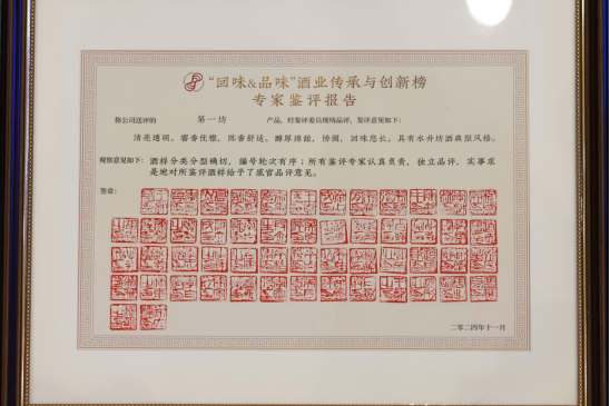 “清亮透明。窖香優雅,陳香舒適。醇厚綿甜,協調,回味悠長。具有水井坊酒典型風格?!薄盎匚?amp;品味”酒業傳承與創新榜專家鑒評報告也給予水井坊“第一坊”高度評價。