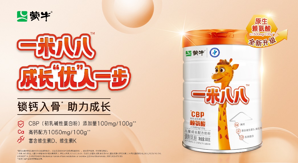 為了滿足兒童在不同成長階段的需求,蒙牛一米八八首創添加初乳堿性蛋白(CBP),鎖鈣入骨,志在為中國兒童骨骼成長發育提供專業的解決方案。上半年,與中國學生營養與健康促進會合作科研實證,蒙牛一米八八奶粉針對學齡前兒童干預組在60天內身高增長明顯,相較于對照組,身高差異高達30%。憑借強大的科研優勢及產品品質,蒙牛一米八八榮獲世界乳品創新獎的兒童乳制品優秀獎,夯實了兒童骨骼發育營養領域的權威地位。