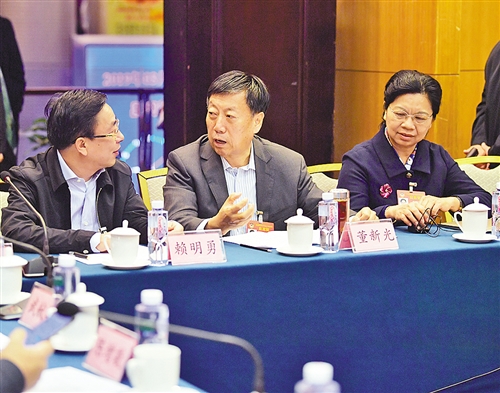左圖 3月10日,全國政協民建界別在駐地舉行小組會議。會前,全國政協委員蒙曉靈、董新光、賴明勇(從右至左)就“如何探索生態優先、綠色發展為導向的新路子”展開交流。 本報記者 高興貴攝