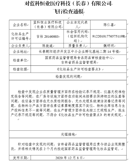 針對檢查中發(fā)現(xiàn)的問題,國家藥監(jiān)局要求吉林省藥品監(jiān)督管理局應(yīng)責(zé)令該企業(yè)限期整改,并將相關(guān)情況在2個(gè)月內(nèi)報(bào)送國家藥品監(jiān)督管理局化妝品監(jiān)管司。