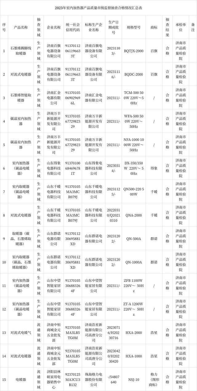 2023年第一批室內(nèi)加熱器產(chǎn)品質(zhì)量市級監(jiān)督抽查結(jié)果