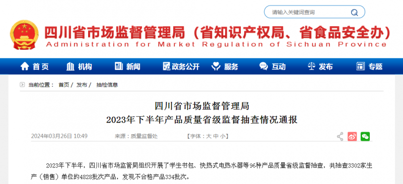 2023年下半年,四川省市場監管局組織開展了學生書包、快熱式電熱水器等96種產品質量省級監督抽查,共抽查3302家生產(銷售)單位的4828批次產品,發現不合格產品334批次。