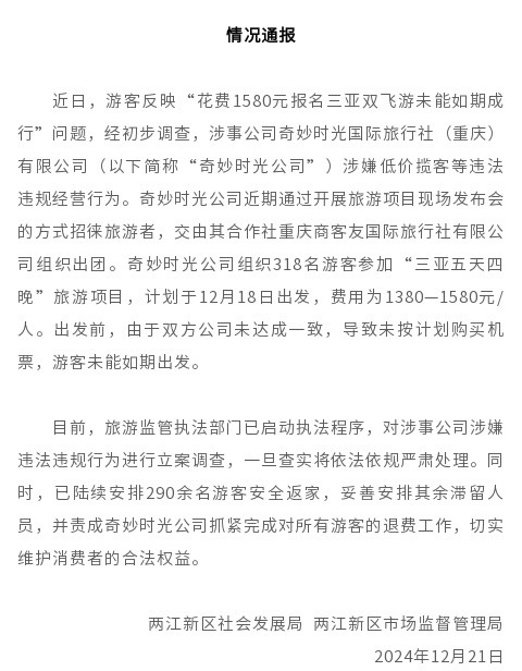 據(jù)通報(bào),經(jīng)初步調(diào)查,涉事公司奇妙時(shí)光國(guó)際旅行社(重慶)有限公司(以下簡(jiǎn)稱“奇妙時(shí)光公司”)涉嫌低價(jià)攬客等違法違規(guī)經(jīng)營(yíng)行為。奇妙時(shí)光公司近期通過開展旅游項(xiàng)目現(xiàn)場(chǎng)發(fā)布會(huì)的方式招徠旅游者,交由其合作方重慶商客友國(guó)際旅行社有限公司組織出團(tuán)。奇妙時(shí)光公司組織318名游客參加“三亞五天四晚”旅游項(xiàng)目,計(jì)劃于12月18日出發(fā),費(fèi)用為每人1380至1580元。出發(fā)前,由于雙方公司未達(dá)成一致,導(dǎo)致未按計(jì)劃購買機(jī)票,游客未能如期出發(fā)。