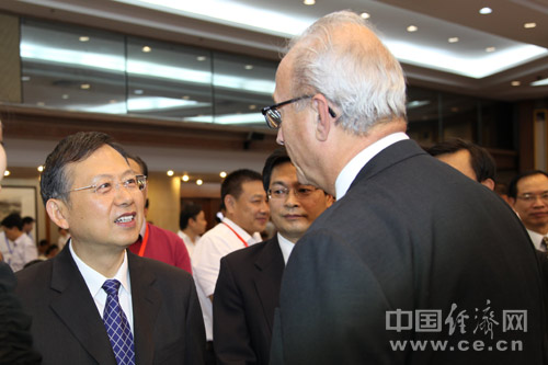 由中國道路交通安全協會、中國汽車技術研究中心和中國經濟網共同主辦的“2013中國道路交通安全論壇”于8月29日在北京首都大酒店舉行。圖為公安部副部長黃明與國際道路交通安全協會主席高斯進行交流。中國經濟網 郝紅波 攝影