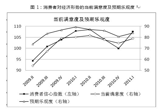 2011年一季度中國消費者信心指數為108,比2010年四季度大幅上升8點,接近近兩年高點。消費者對當前經濟形勢的滿意度和對未來經濟走勢的預期樂觀度均明顯上升,持樂觀態度的消費者比重均接近兩年內的最高點。